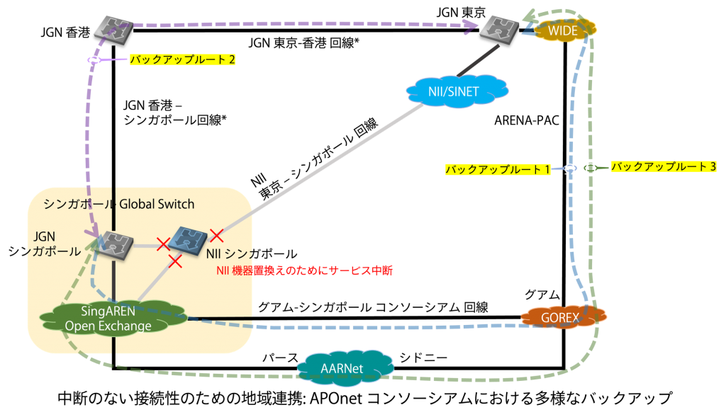 JGNによるバックアップが開始された後、JGN回線では延期できない定期の保守作業が予定されていました。そのためバックアップは、別のAPOnetメンバーであるArterial Research and Educational Network (ARENA-PAC) が運営するグアム経由の回線と、APOnetの複数のメンバーを含むGuam-SGコンソーシアムに移されました(バックアップルート1)。JGN回線の計画作業が早期に完了し、バックアップはJGN回線に戻されました(バックアップルート2)。